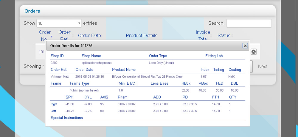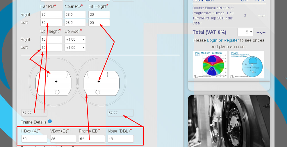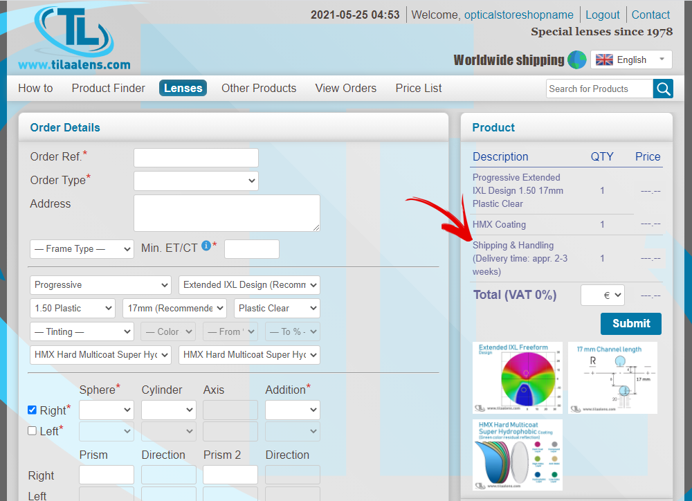 Then you can view product and fill rest of product info: lens powers, coating etc. to see final product price and delivery time