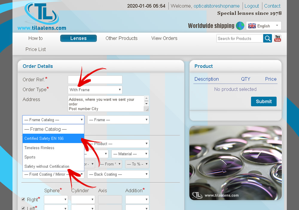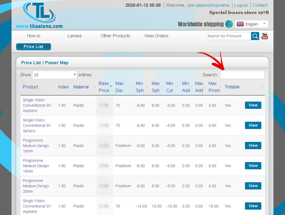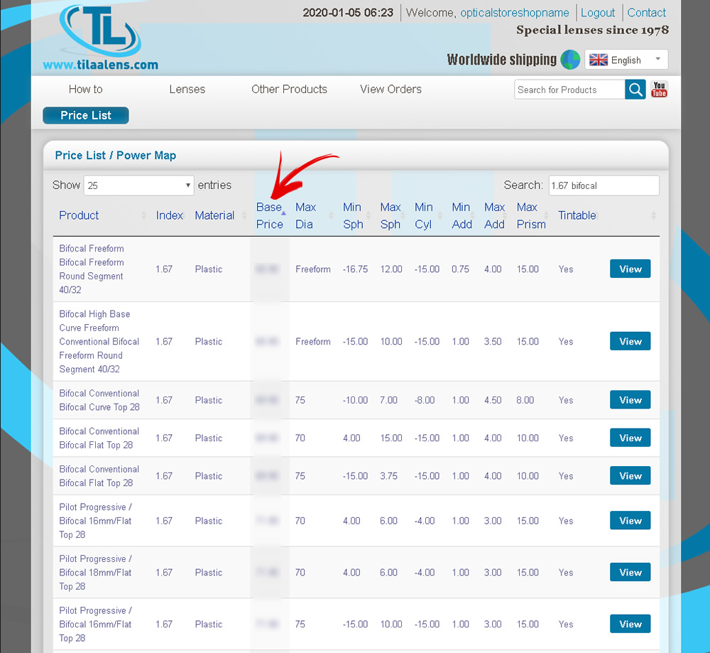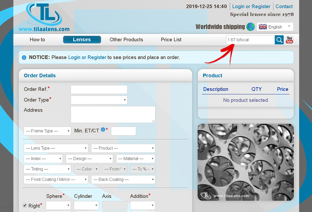 With the search bar you can quickly find products that you are looking for. For example, if you are looking for Bifocal with 1.67 index, you can type “1.67 bifocal” into the search field: