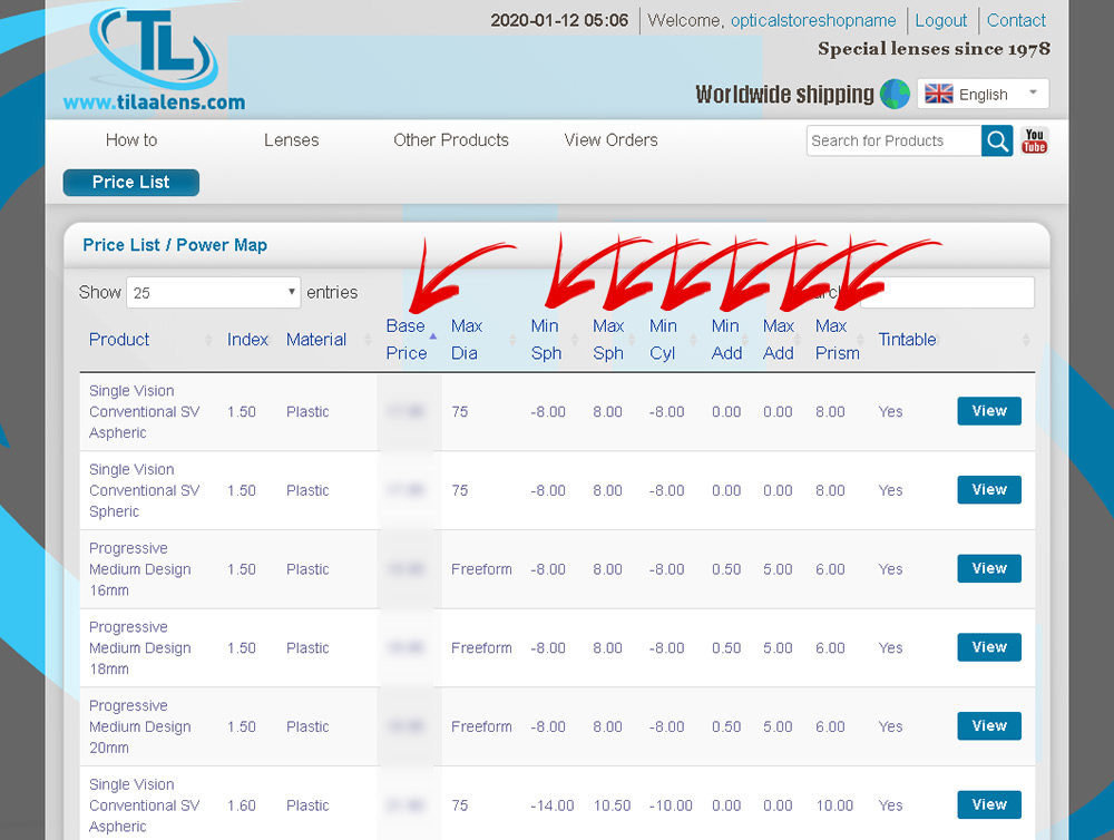 You can sort by (press location) base price, SPH power, CYL power, add, prism etc.